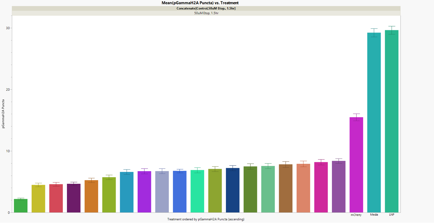 Figure 2. Each bar represents a different combination of protective genes tested in human cells exposed to a strong DNA-damaging chemical. The Y-axis shows the amount of DNA damage (quantified by γH2AX puncta counts) — so shorter bars mean stronger protection.