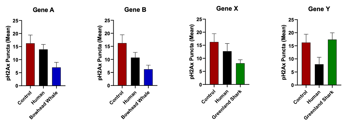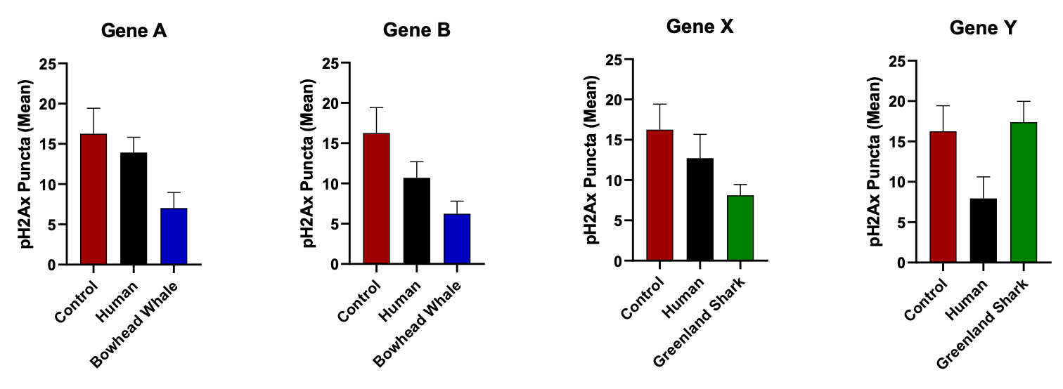 Figure 1. Each mini-chart shows how much DNA damage occurred when cells were given a specific “longevity gene” from either humans or a long-lived animal (such as a bowhead whale or Greenland shark). The height of the bars represents the number of DNA breaks (as measured by γH2AX-stained puncta, a standard marker of double-strand DNA damage).